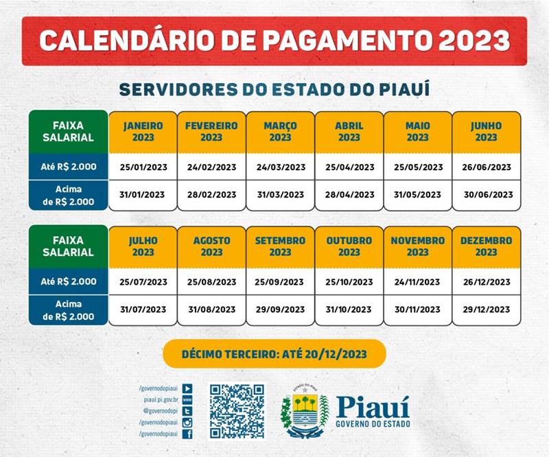 O Governo do Piauí divulgou, nesta sexta-feira (6), a nova tabela de pagamento dos servidores estaduais. Seguindo o mesmo sistema das gestões anteriores, os servidores continuarão a receber os salários dentro do mês trabalhado. Continua depois da publicidade