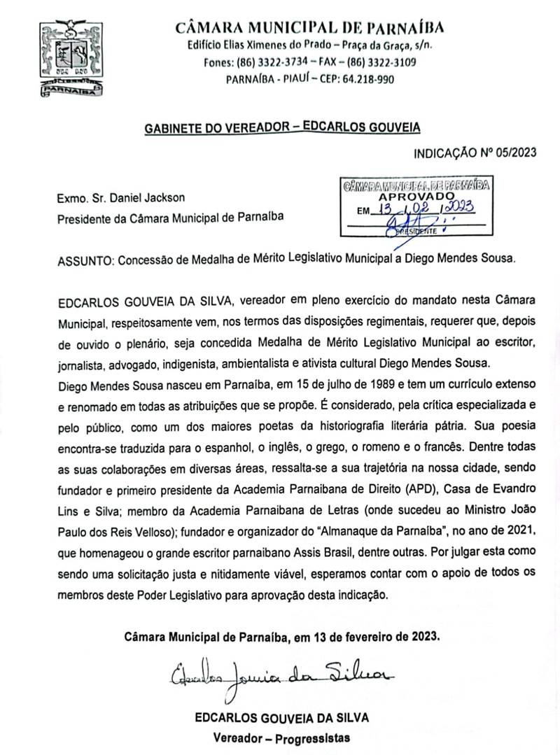 Com indicação proposta pelo vereador, Edcarlos Gouveia da Silva, do Progressistas, a Câmara Municipal de Parnaíba aprovou, no último dia 13 de fevereiro de 2023, a concessão da medalha de Mérito Legislativo municipal ao escritor, advogado, jornalista e funcionário público federal, Diego Mendes Sousa. Continua depois da publicidade