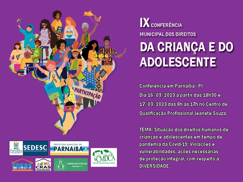A prefeitura de Parnaíba, através da secretaria municipal de Desenvolvimento Social e Cidadania, vai realizar a 9ª Conferência municipal dos direitos da criança e do adolescente de Parnaíba, no auditório do Centro de Qualificação Profissional Jeanate Moraes Souza, nos dias 16 e 17 de marco. Continua depois da publicidade