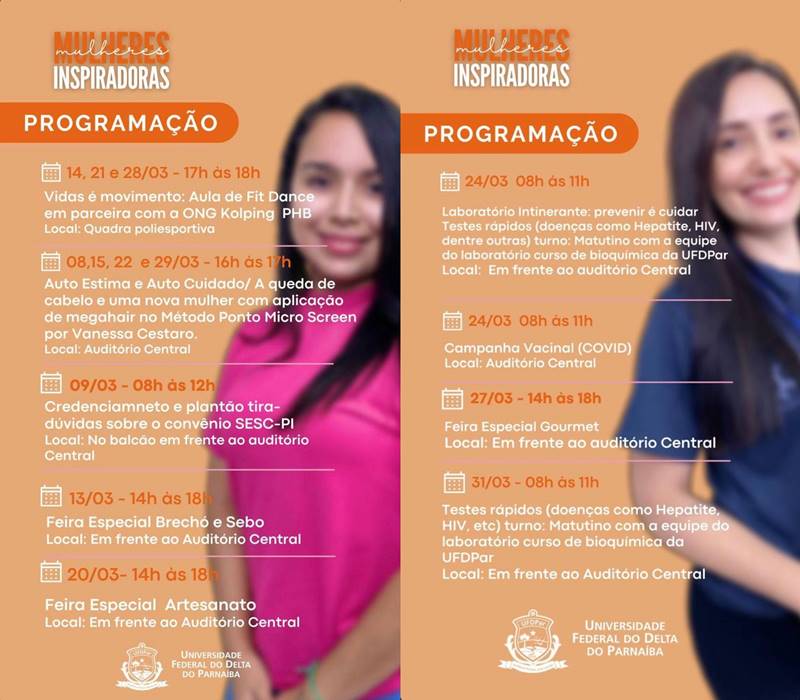 Durante todo o mês de março a Pró-Reitoria de Gestão de Pessoas (PROGEP) da Universidade Federal do Delta do Parnaíba (UFDPar), por meio da Coordenação de Desenvolvimento de Pessoas (CDP) e a Divisão de Qualidade de Vida no Trabalho (DQVT), prepararam uma programação especial para as mulheres, com o tema: “Mulheres que inspiram”. Continua depois da publicidade