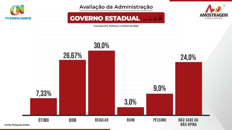 Ao serem questionados sobre a avaliação dos três meses de gestão do governador Rafael Fonteles (PT), 7,33% consideram a atuação como ótima, enquanto 26,67% avaliaram como boa, 30,0 % regular, 3,0% ruim e 9,0% péssima. Não sabe / não opina 24,0%.