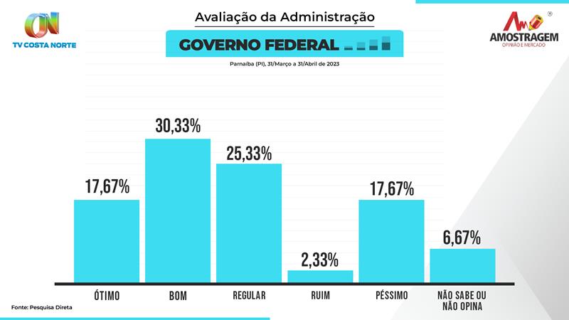 A TV Costa Norte divulgou nesta quarta-feira (12), uma pesquisa realizada pelo instituto Amostragem sobre a avaliação dos parnaibanos aos governos municipal, estadual e federal. A pesquisa foi realizada entre os dias 31 de março e 03 de abril. Continua depois da publicidade