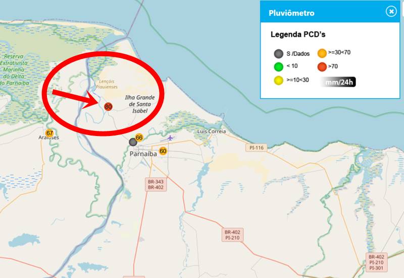 De acordo com o Cemanden – Centro Nacional de Monitoramento e Alertas de Desastres Naturais, que mantém estações meteorológicas no litoral piauiense, a cidade de Ilha Grande do Piauí registrou 80 mm de chuva nas últimas 24h.