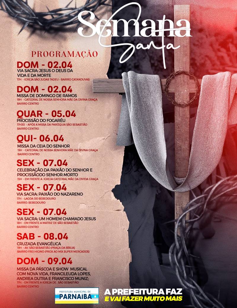 A programação da Semana Santa em Parnaíba, retoma a partir da quarta-feira (05), com a procissão do Fogaréu, após a missa na paróquia de São Sebastião. Confira toda a programação abaixo.