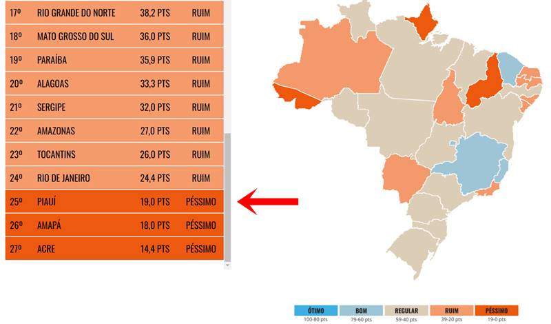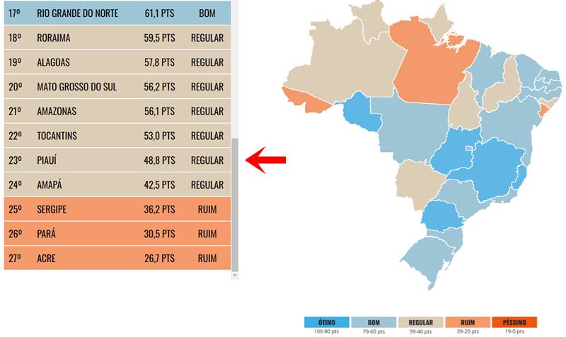 Os dados são organizados em um ranking por estado. No que se refere ao poder Executivo estadual, o Piauí ocupou a 5ª pior posição no país, com a nota 48,8, em uma escala que varia de 0 a 100. Já no poder Legislativo, o estado obteve a 3ª pior nota, 19.