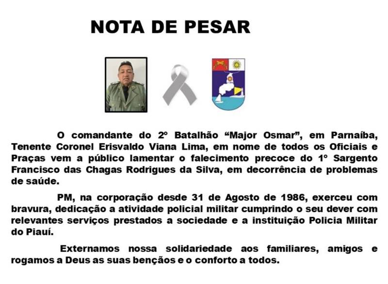 O 1º Sargento PM Francisco das Chagas Rodrigues da Silva, lotado no 2º Batalhão de Polícia Militar – Batalhão Major Osmar, em Parnaíba, morreu na tarde desta sexta-feira (10), vítima de um AVC – acidente vascular cerebral. Ele estava internado em uma UTI já há alguns dias. Continua depois da publicidade