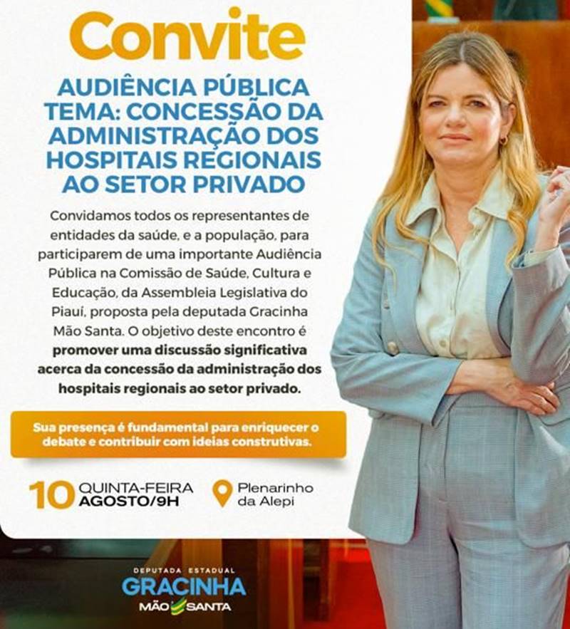 A Assembleia Legislativa do Piauí realiza, na quinta-feira (10), audiência pública sobre a concessão da administração dos hospitais estaduais para a iniciativa privada. Com início previsto para as 9 horas, no Plenarinho da Casa, a audiência está sob a organização da Comissão de Saúde, Educação e Cultura. Continua depois da publicidade