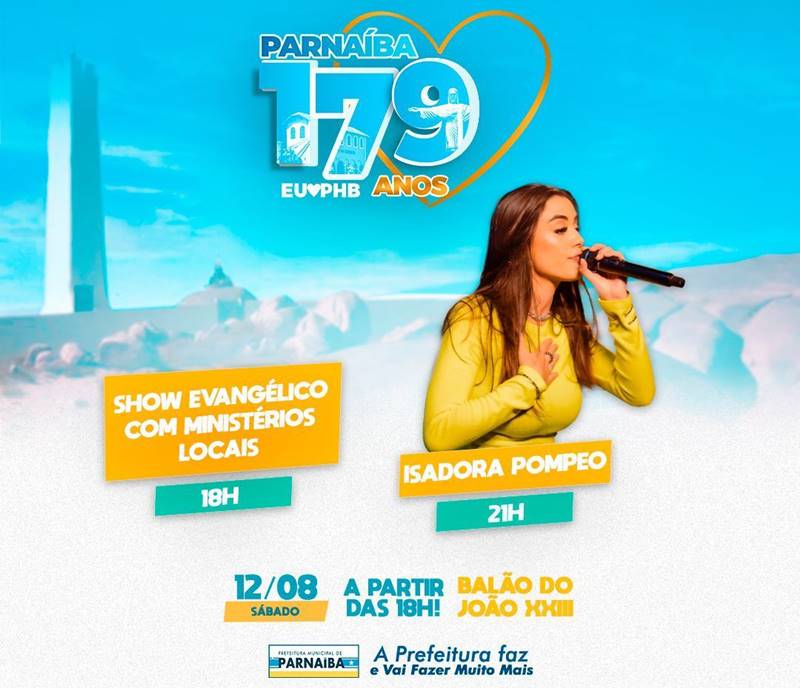 Dando continuidade à programação alusiva ao aniversário da cidade de Parnaíba, a partir das 19h deste sábado (12) acontece o show da cantora gospel Isadora Pompeo, que contará com a participação de ministério locais. Continua depois da publicidade