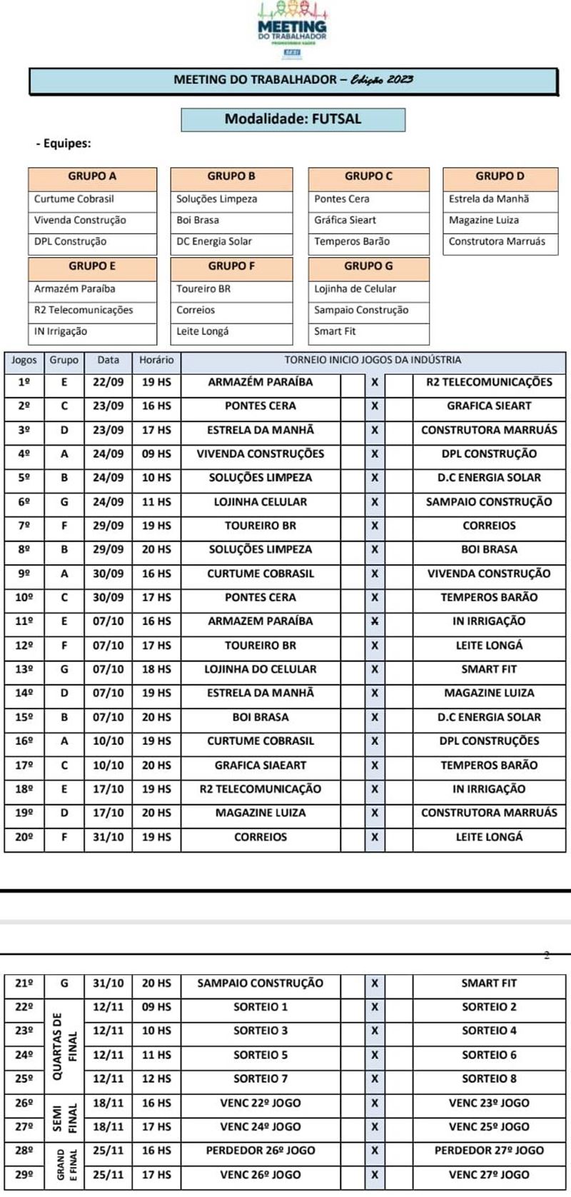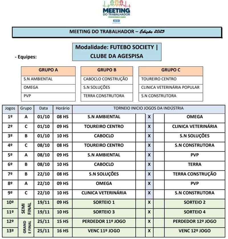 Veja abaixo a tabela com times, grupos, datas e horários do Meeting da Indústria 2023: