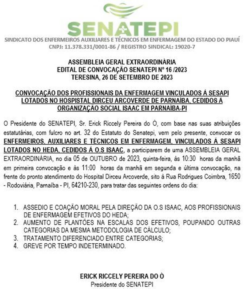 O presidente do SENATEPI – Sindicato dos enfermeiros auxiliares e técnicos em enfermagem do estado do Piauí, Sr. Erick Riccely Pereira do Ó, emitiu um edital de convocação do sindicato, para a realização de assembleia geral extraordinária, onde, dentre outros assuntos será discutida a paralização da categoria por tempo indeterminado. Continua depois da publicidade