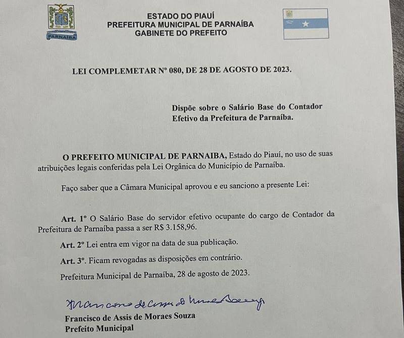 O prefeito Francisco de Assis de Moraes Souza, Mão Santa, assinou na tarde desta sexta-feira (16), a Lei Complementar nº 080, de 28 de agosto de 2023, que definiu o salário-base para servidores públicos municipais efetivos, ocupantes do cargo de Contador. Continua depois da publicidade