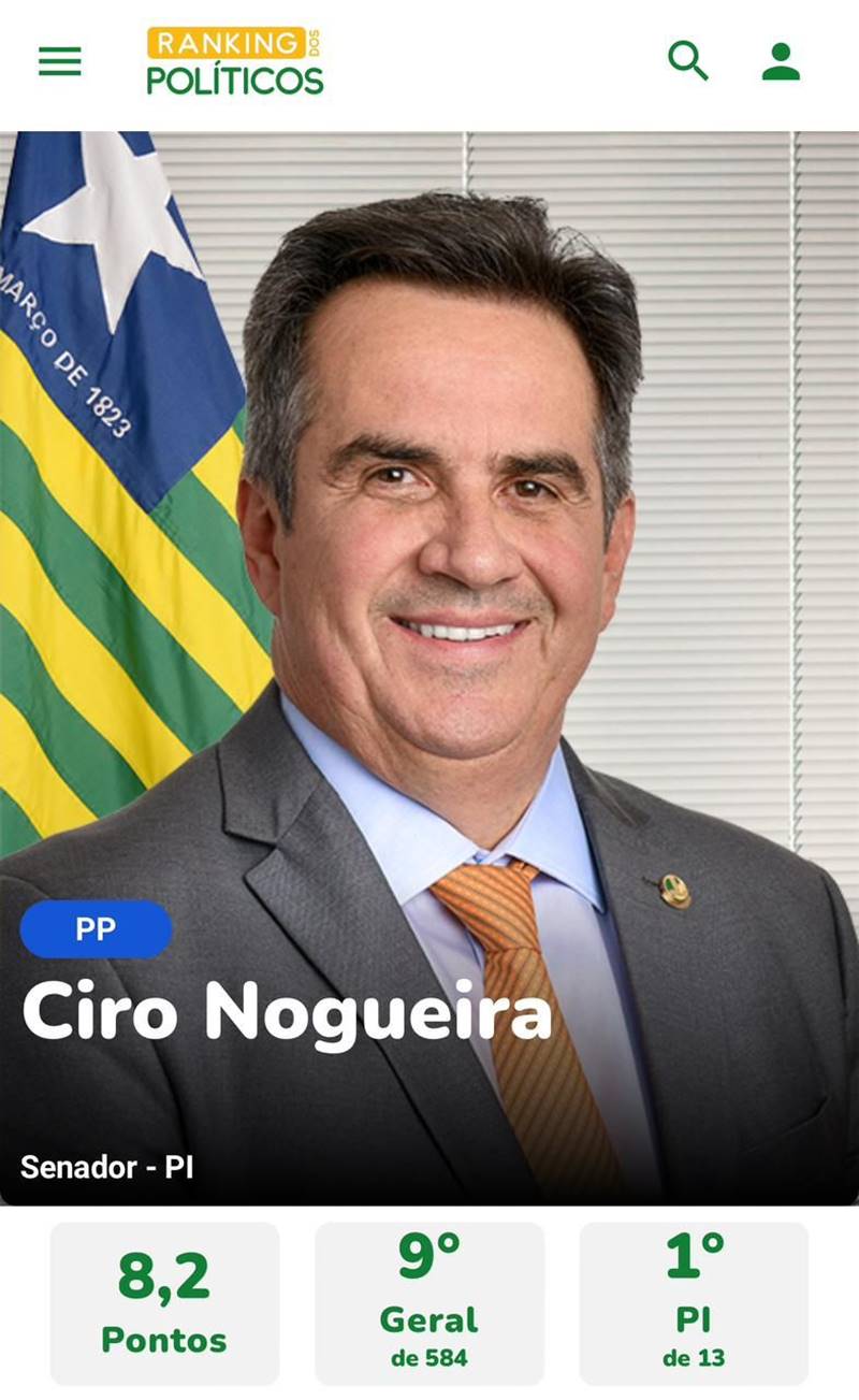 Ciro Nogueira também ficou entre os 10 melhores parlamentares do Brasil no levantamento, atingindo o nono lugar entre os 584 congressistas da Câmara e do Senado.