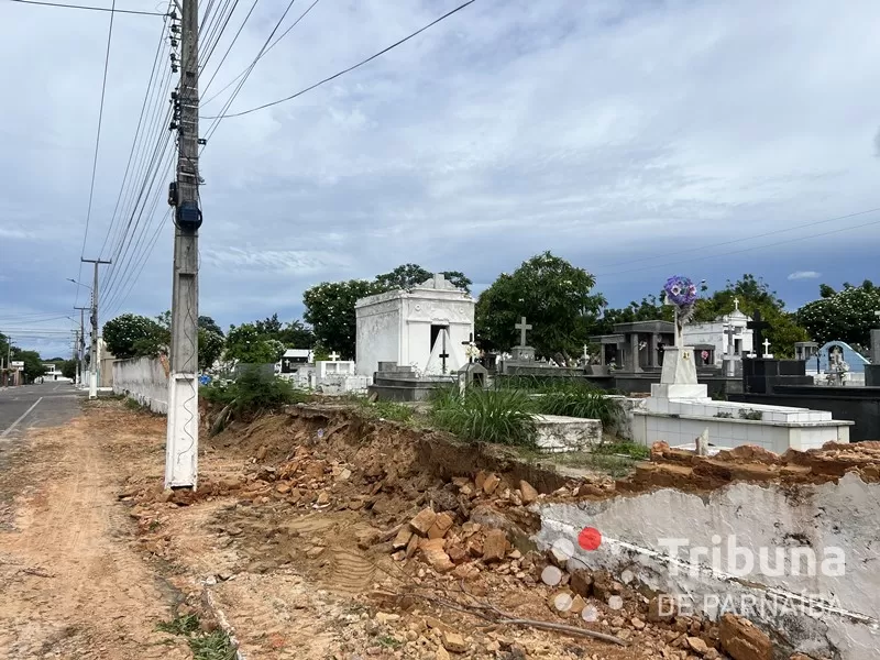 Cerca de 35 metros do muro do cemitério da Igualdade, localizado no centro de Parnaíba, caiu durante a chuva deste sábado (30).