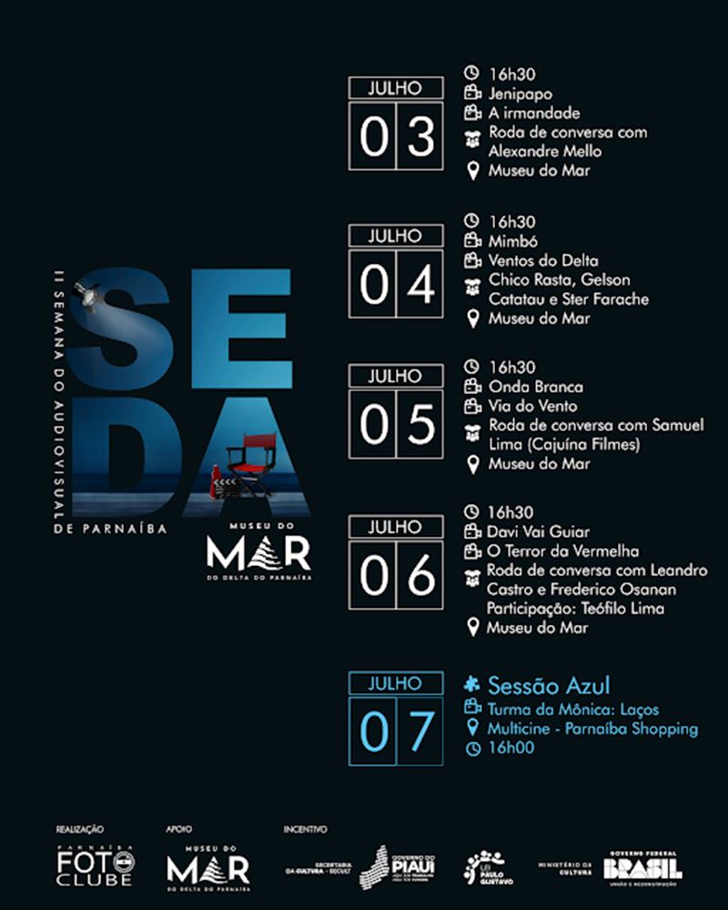 A SEDA – II Semana do Audiovisual de Parnaíba é um festival de audiovisual, cuja programação contará com exibições de produções audiovisuais piauienses e nacionais e rodas de conversa, além de ações inclusivas.