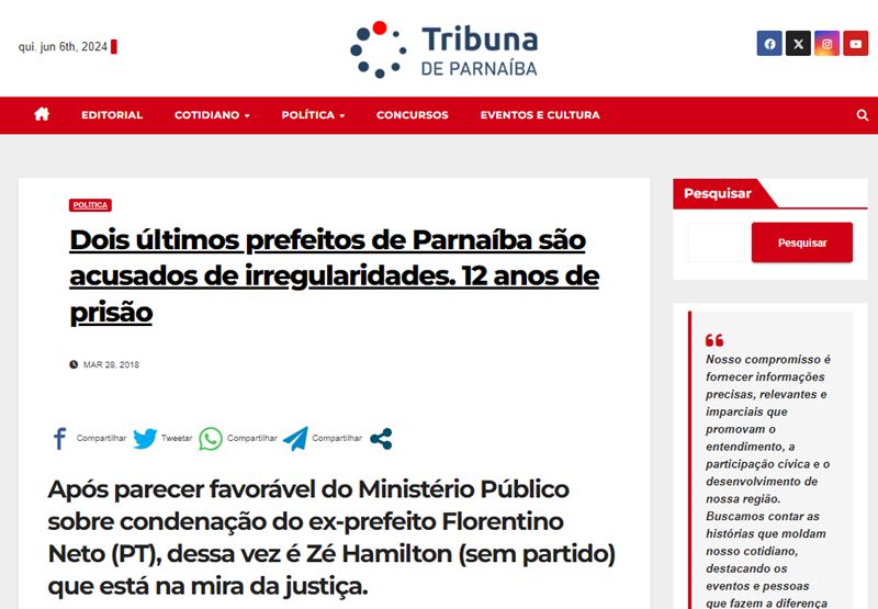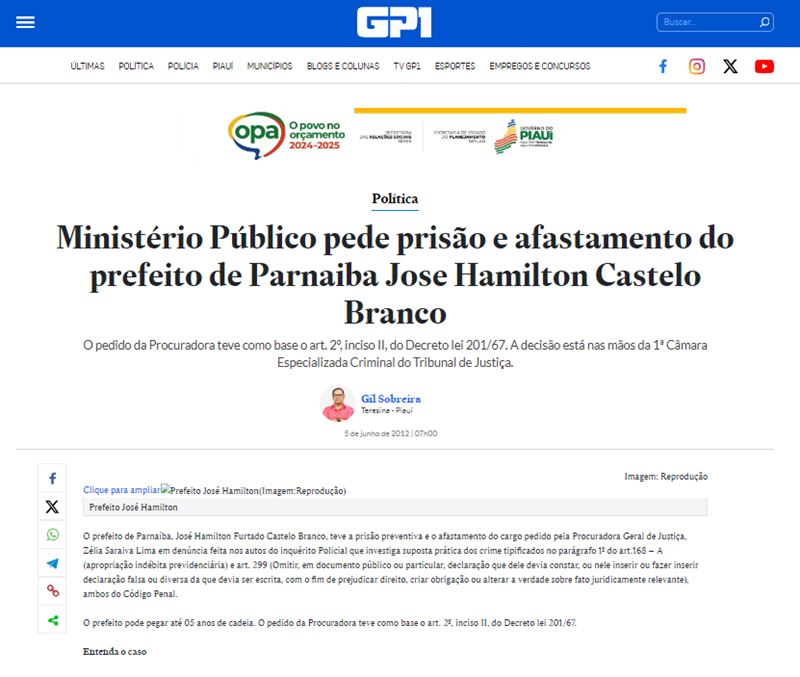 O primeiro, um ex-prefeito que governou Parnaíba por três mandatos, carrega um histórico marcado por controvérsias judiciais. Em seu último mandato (2012), teve a prisão preventiva e o afastamento do cargo solicitados pela Procuradora Geral de Justiça, Zélia Saraiva Lima, em função de denúncias graves de apropriação indébita previdenciária e falsificação de documentos. Estas acusações, levantam dúvidas sobre sua integridade e capacidade de gerir a cidade com a transparência e a responsabilidade que os tempos exigem. Clique nas imagens e confira as matérias em seus respectivos portais.