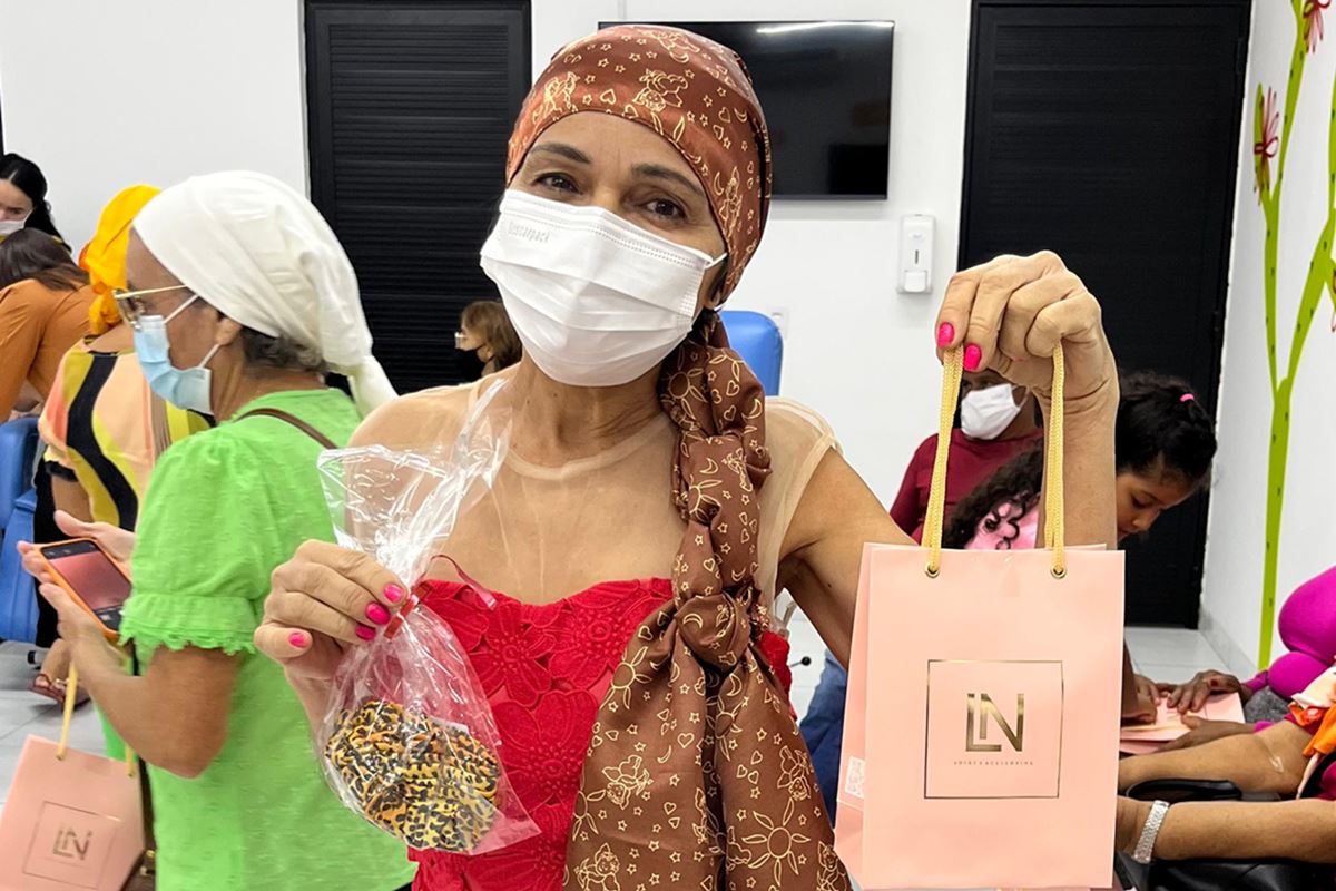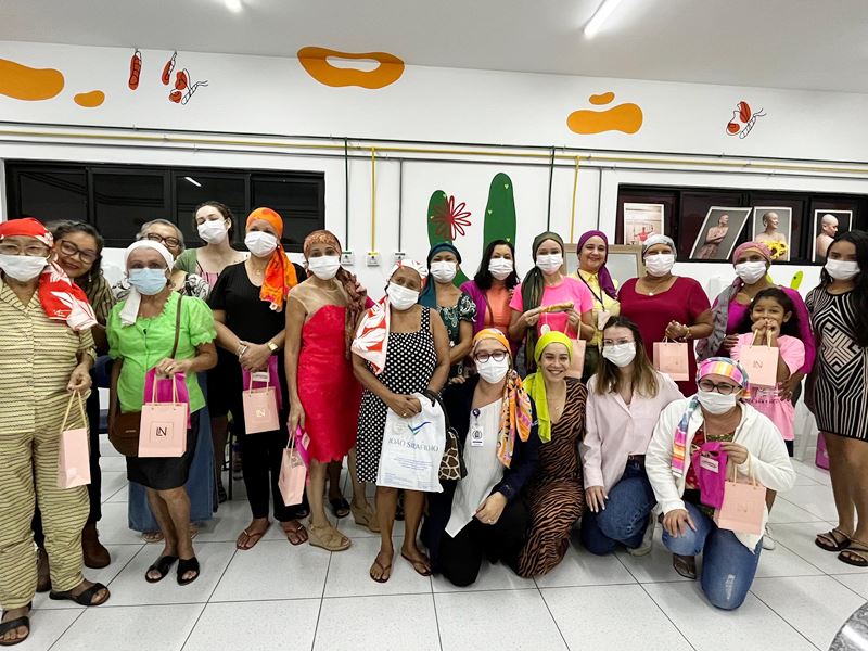 A ministrante da oficina de técnicas de amarrar o lenço Joyce Bezerra, paciente oncológica, falou sobre como o autocuidado ajuda em seu tratamento melhorando a autoestima amenizando o tratamento. Contribuíram ainda com o momento uma representante da loja Bom Batom com as técnicas de automaquiagem e doação de itens de beleza, a Vell Bizz, realizando a doação de lindos lenços com diversas estampas, e a loja LN Jóias que presenteou nossas pacientes com acessórios especiais pensados para nossas pacientes oncológicas.