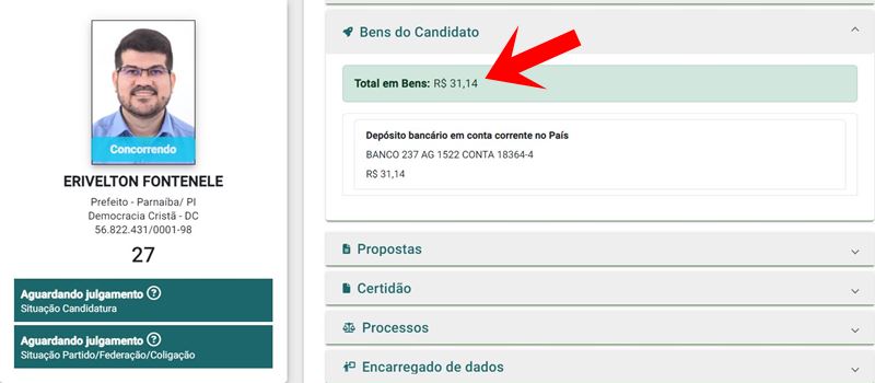 Algumas informações chamam a atenção, mas são “aceitáveis” entre aspas, como por exemplo, o fato do engenheiro Francisco Emanuel não declarar bens, pois, pode ter os bens em nome da filha, da esposa, da mãe, etc. Ou até mesmo os R$ 31,14 (trinta e um reais e quatorze centavos) que o candidato Erivelton Fontenele, diz ter em conta corrente.