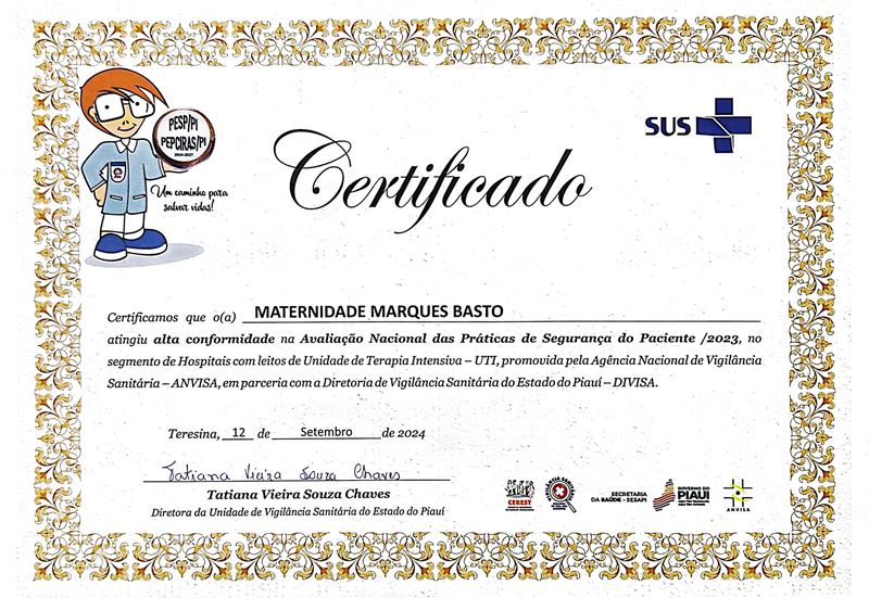 “O certificado comprova que o Hospital e Maternidade Marques Basto está dentro dos critérios exigidos pela vigilância sanitária em segurança do paciente e boas práticas com o paciente. Confirmando assim que nossa equipe de qualidade junto ao paciente tem desenvolvido um trabalho eficaz e eficiente junto a instituição e a UTI”, Weruscka Galas enfermeira chefe.