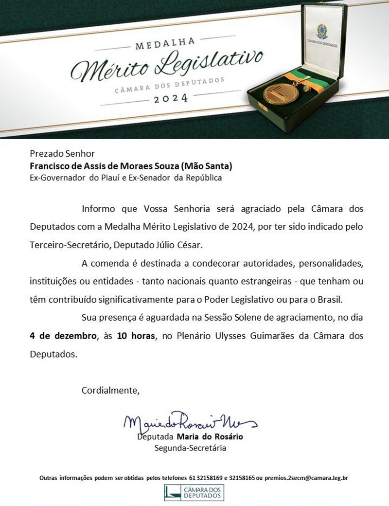 A Medalha do Mérito Legislativo é destinada a personalidades e instituições que contribuíram de forma significativa para o desenvolvimento do país e para o fortalecimento da democracia. A homenagem a Mão Santa é um reconhecimento à sua longa trajetória política, repleta de momentos marcantes e por vezes polêmicos, mas que consolidaram seu papel como uma das figuras mais emblemáticas da política piauiense.