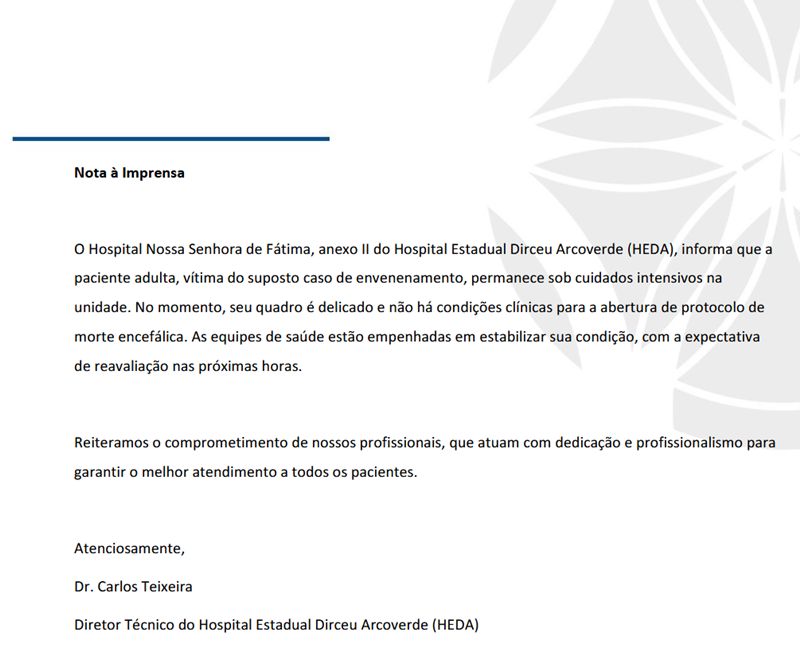 De acordo com o comunicado, a paciente, que é atendida na unidade, segue sob cuidados intensivos. Apesar da gravidade do quadro, o hospital negou categoricamente que tenha havido óbito. Segundo o diretor técnico do HEDA, Dr. Carlos Teixeira, “não há condições clínicas para a abertura de protocolo de morte encefálica” e a equipe médica está empenhada em estabilizar a paciente, com previsão de reavaliação em breve. Confira a nota: