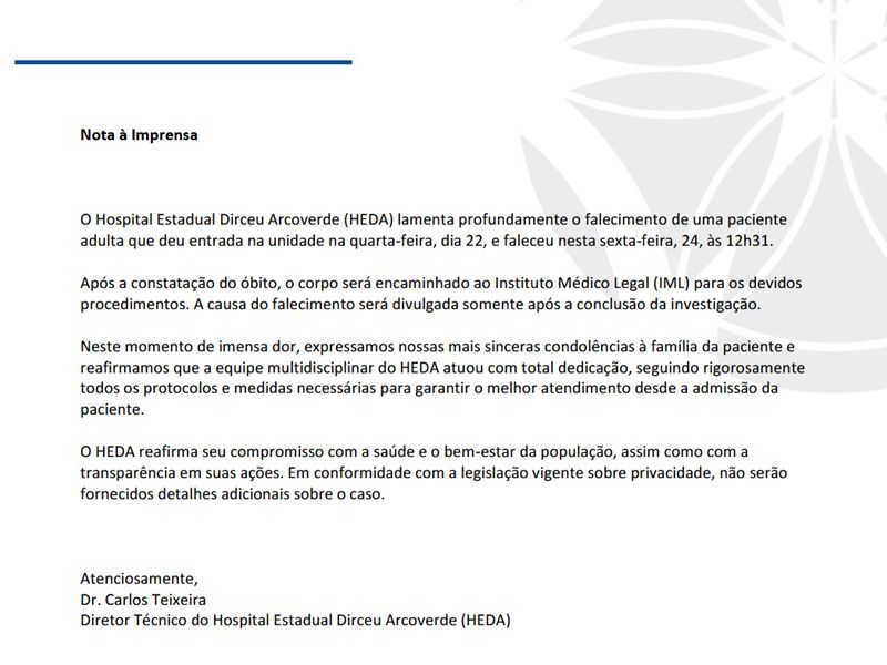 A direção do hospital destacou que sua equipe multidisciplinar seguiu todos os protocolos médicos e atuou com total dedicação no atendimento à paciente desde sua admissão. Além disso, reiterou seu compromisso com a transparência e o bem-estar da população, afirmando que não serão divulgados mais detalhes do caso devido à legislação vigente sobre privacidade.