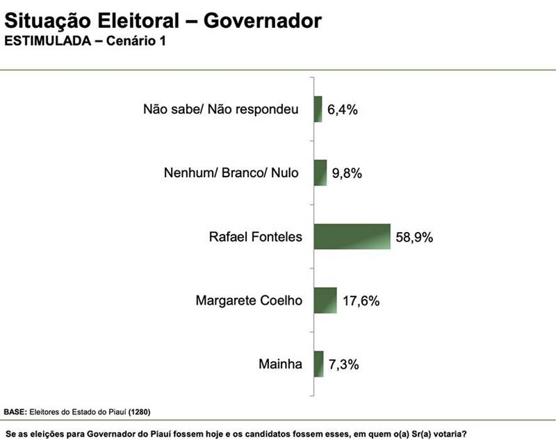 Em se tratando de disputa eleitoral, no primeiro cenário, Rafael Fonteles (PT) aparece com 58,9% das intenções de votos 🟢, tendo a ex-vice-governadora e ex-deputada Margarete Coelho (Progressistas) em segundo lugar com 17,6% 🔵, e o ex-deputado Mainha (PL) com 7,3% 🔴.
