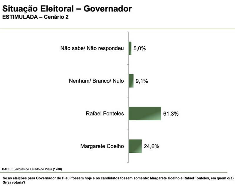 Num segundo cenário, onde aparece apenas o nome de Rafael Fonteles contra Margarete, o atual governador tem 61,3% 💪 e a atual diretora do Sebrae Nacional aparece com 24,6%.