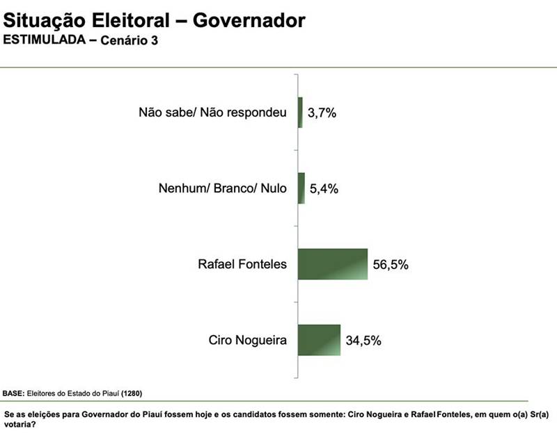 Já em um terceiro cenário, caso o senador Ciro Nogueira disputasse para governador e não para a reeleição ao Senado, ele teria 34,5%, contra 56,5% de Rafael Fonteles.
