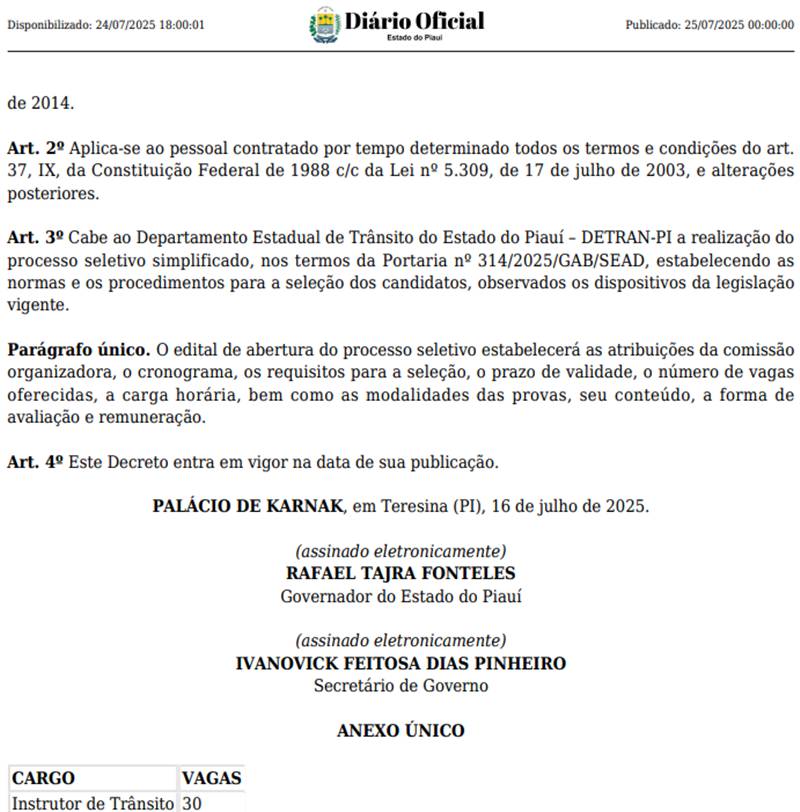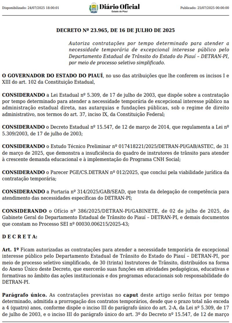 O Governo do Piauí publicou o Decreto nº 23.965/2025, autorizando a contratação temporária de 30 instrutores de trânsito para atuar no Departamento Estadual de Trânsito (DETRAN-PI). As vagas visam atender a um aumento da demanda educacional e fortalecer o Programa CNH Social, iniciativa que garante acesso gratuito à carteira nacional de habilitação para pessoas em situação de vulnerabilidade. ✅
