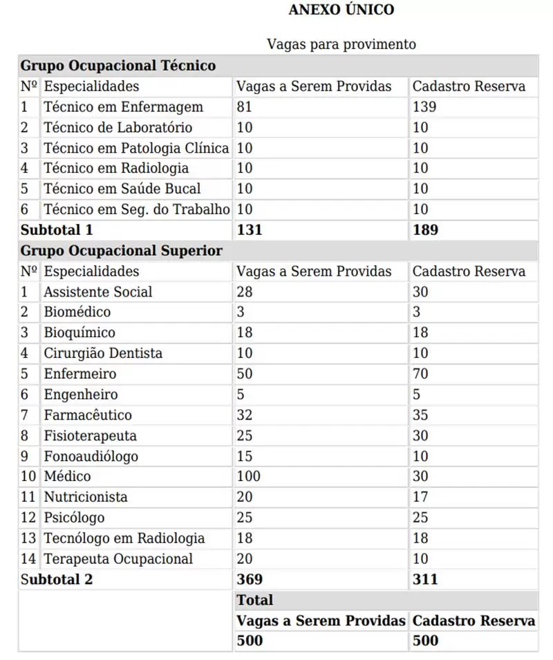 O certame contempla cargos de Agente Técnico de Serviço e Agente Superior de Serviço, que exigem formação de níveis técnico e superior. A medida atende a uma demanda urgente da rede estadual de saúde, que carece de reforço qualificado no atendimento básico e especializado.