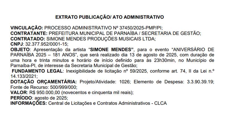 Porém, quatro dias depois, no Diário Oficial do município, em 15 de agosto, a própria Prefeitura publicou o contrato do show, mantendo o valor de R$ 950 mil. (Página 05 – clique aqui)