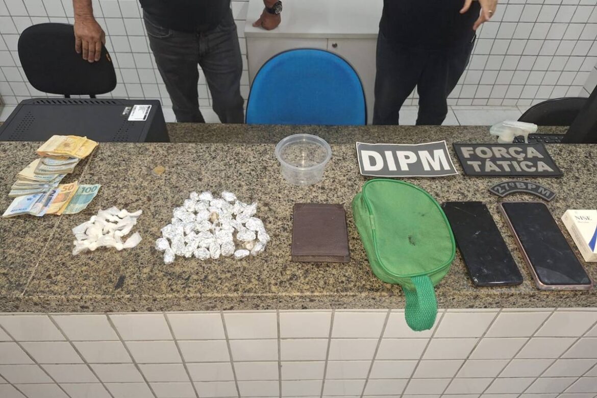 No imóvel alvo da ocorrência, a PM encontrou 41 porções de maconha, 12 porções de cocaína, dinheiro trocado e uma motocicleta Honda Pop. Além da “Tranca Rua”, outra mulher, M.S.S., também foi detida pelo crime de tráfico.