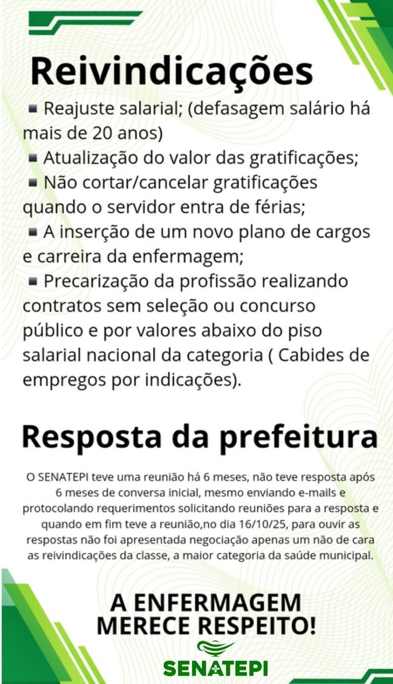 O SENATEPI (Sindicato dos Enfermeiros, Técnicos e Auxiliares de Enfermagem do Piauí) afirma que tentou, por seis meses, abrir diálogo com a gestão. Foram protocolos, e-mails, ofícios e pedidos de reunião, todos ignorados. Quando finalmente foram recebidos, no último dia 16 de outubro, a resposta da Prefeitura foi um sonoro “não” a todas as reivindicações. Nenhuma proposta, nenhum plano, nenhum gesto de empatia.