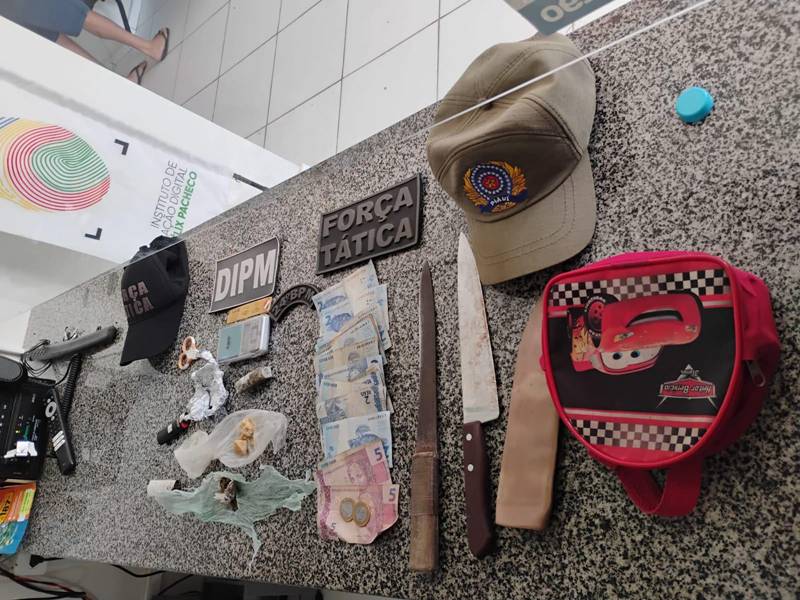 A abordagem foi imediata. Dentro da bolsa, os policiais encontraram substâncias análogas à maconha e crack, além de uma balança de precisão, R$ 46,00 em dinheiro fracionado e duas facas. Todo o material foi apreendido. 💰🔪📦