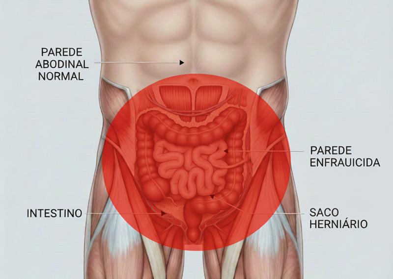 A hérnia inguinal é uma condição médica caracterizada pelo deslocamento de parte do intestino ou tecido abdominal através de uma área enfraquecida da musculatura da virilha. Esse deslocamento forma um inchaço visível, que pode causar dor, desconforto e sensação de peso, especialmente ao realizar esforços físicos, tossir ou permanecer muito tempo em pé.