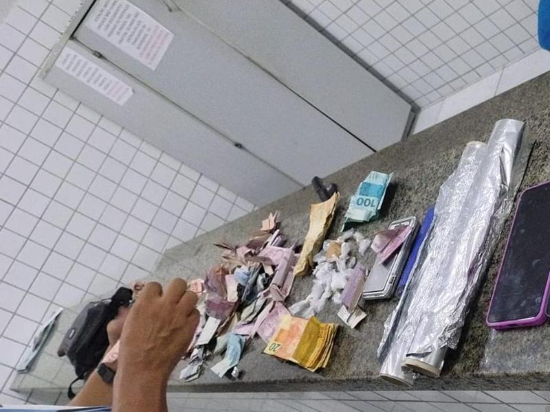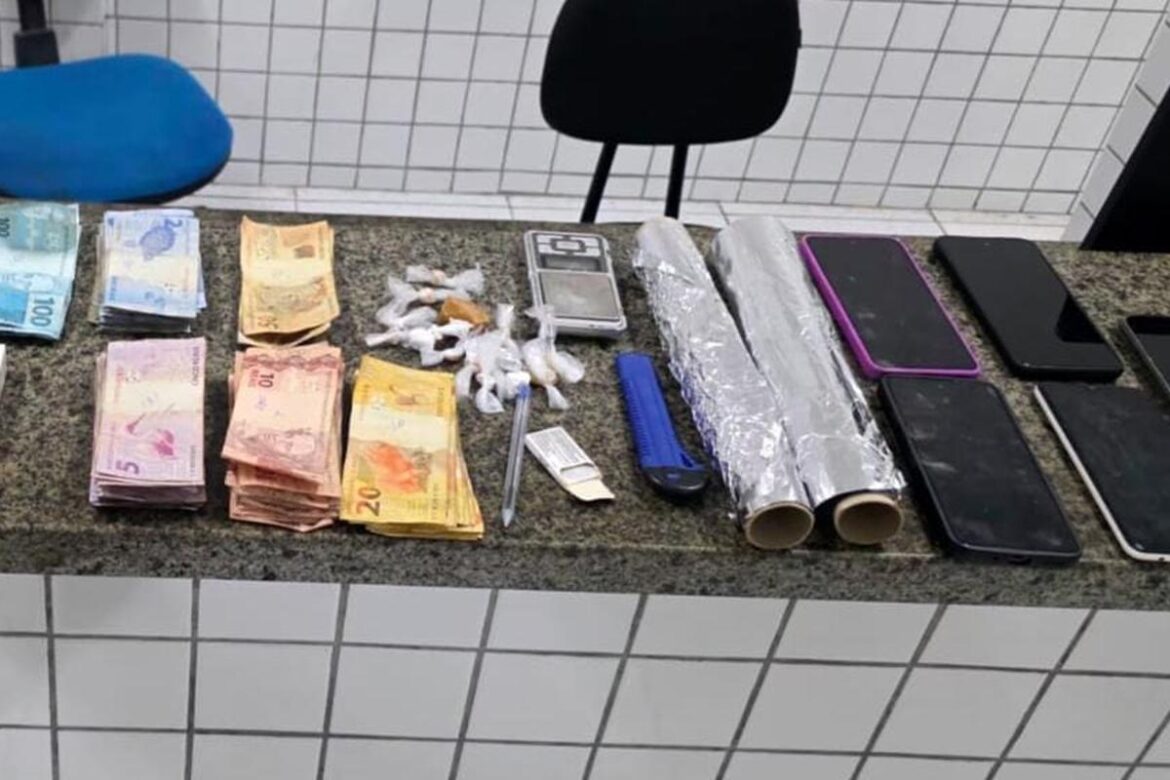 Com ele, foram apreendidas 11 porções de crack prontas para venda, além de uma porção maior da droga, cocaína, maconha, uma balança de precisão, estilete, rolos de papel alumínio, R$ 1.352,70 em dinheiro e cinco celulares 📱.