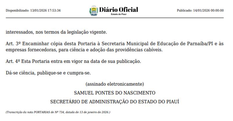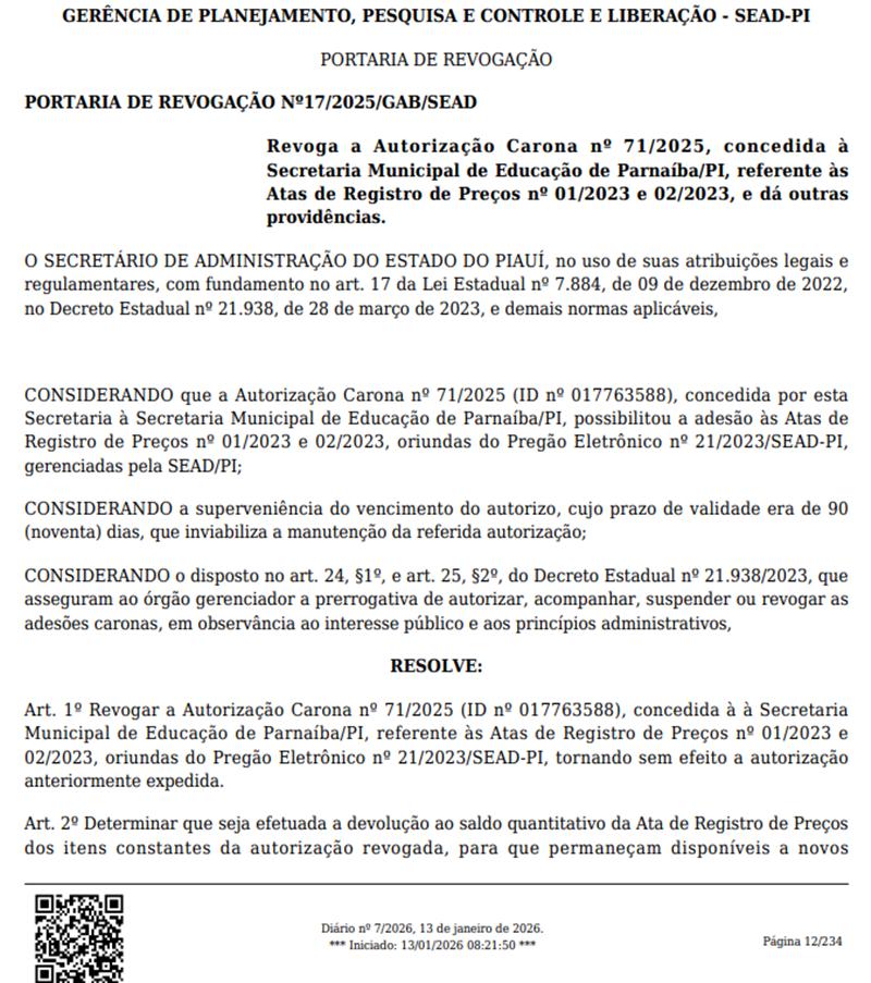 A situação está registrada na Portaria de Revogação nº 17/2025/GAB/SEAD, publicada no Diário Oficial do Estado do Piauí – Edição nº 7/2026, que revoga a Autorização Carona nº 71/2025, concedida à Secretaria Municipal de Educação de Parnaíba.