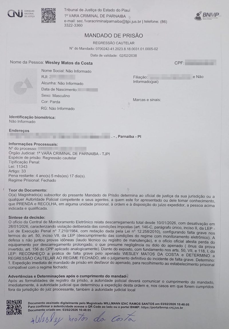 O mandado de prisão foi expedido pela Tribunal de Justiça do Estado do Piauí, por meio da 1ª Vara Criminal de Parnaíba, após a constatação de desativação e descarregamento prolongado do equipamento de monitoramento, caracterizando falta grave.