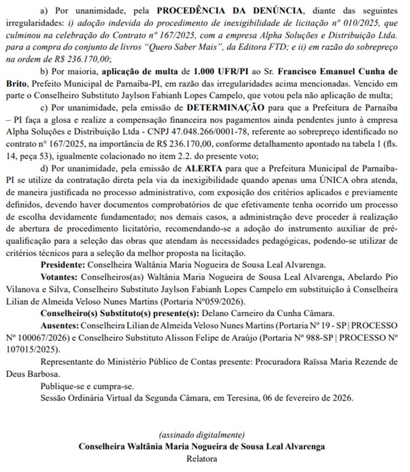 A decisão envolve a inexigibilidade de licitação nº 010/2025, que resultou no Contrato nº 167/2025, firmado pela Prefeitura Municipal de Parnaíba para aquisição do conjunto de livros “Quero Saber Mais”.