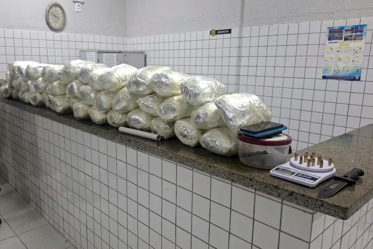 Um homem identificado pelas iniciais P.G.B.O. foi preso em flagrante e conduzido à Central de Flagrantes. Ele responderá por tráfico de drogas e posse ilegal de munição de uso restrito.