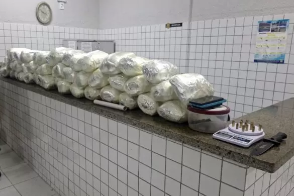Força Tática encontra skunk, cocaína, munições e prende suspeito em flagrante. Ação no litoral causa prejuízo milionário ao crime organizado às vésperas do Carnaval. Condomínio era usado como base de armazenamento do tráfico.