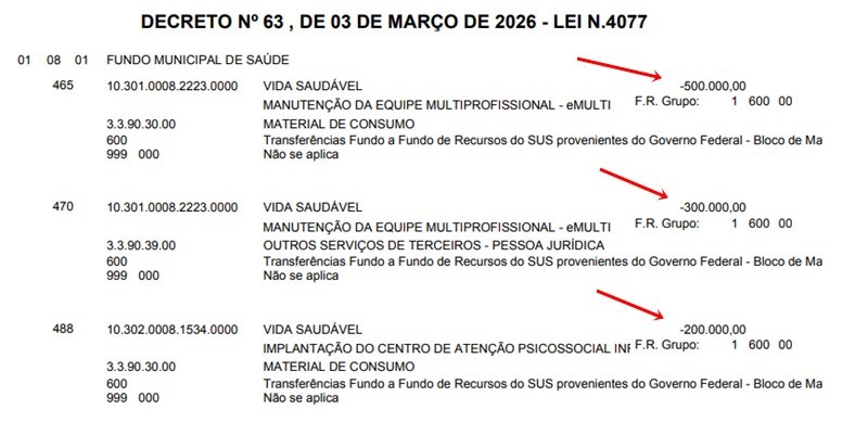Decreto municipal anula recursos de programas como Estratégia Saúde da Família, CAPS infantil e apoio a instituições filantrópicas. Mais de R$ 2,7 milhões que seriam destinados a entidades de saúde deixam de existir no orçamento após remanejamento da prefeitura.