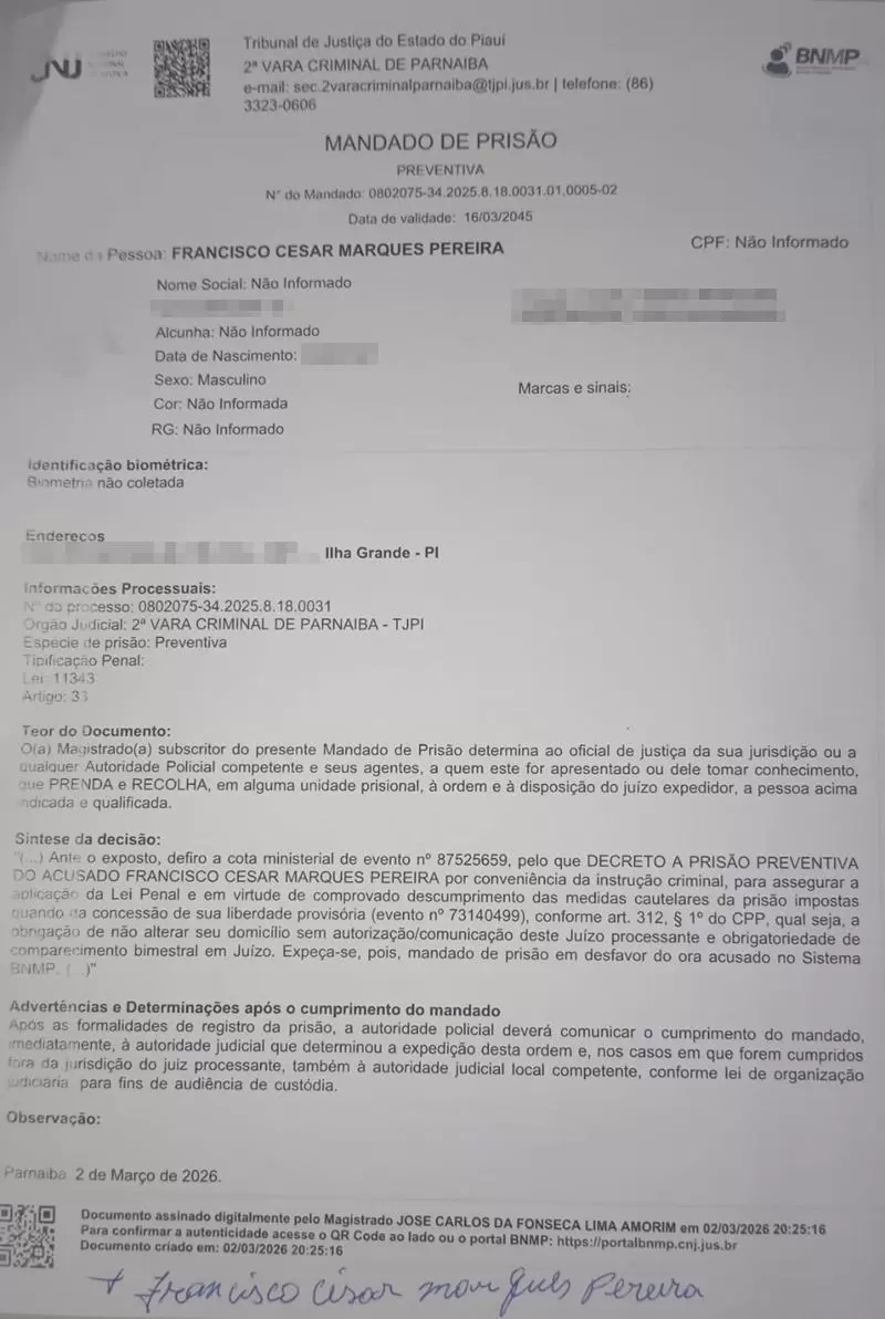 📌 A ordem judicial foi expedida pelo Tribunal de Justiça do Estado do Piauí, por meio da 2ª Vara Criminal de Parnaíba, com base no Artigo 33 da Lei 11.343/2006, que trata do crime de tráfico de drogas.