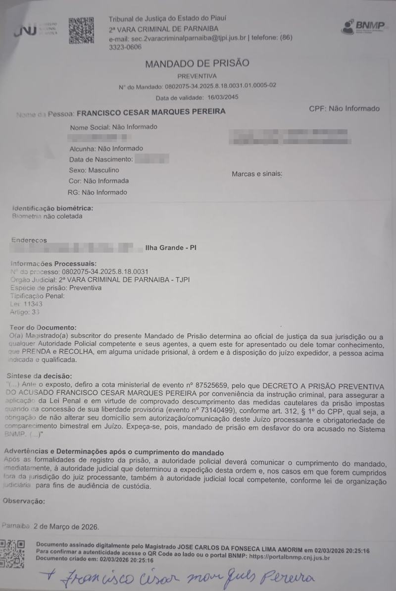 📌 A ordem judicial foi expedida pelo Tribunal de Justiça do Estado do Piauí, por meio da 2ª Vara Criminal de Parnaíba, com base no Artigo 33 da Lei 11.343/2006, que trata do crime de tráfico de drogas.